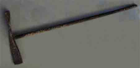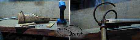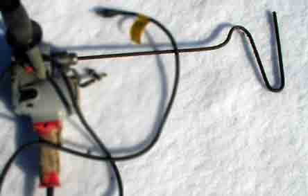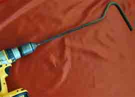After bending, the clamp is removed (and/ or temporary wood screws also). The corkscrew bit has been formed. With straight end in pipe and wrench, the angle can be adjusted to form a good rotational balance. With #3 rebar, it is easy to adjust angle by hand. #3 bar may wear down through heavy use. # 4bar is stronger, but also will want more drill power and skill to bend. (Shims and wood screws may not be needed if a groove is carved in the whittled stick first).