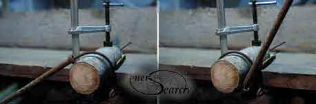 Next the (assembly of ply, shim and) whittled stick is clamped to a firm surface, (with ply flat to surface). Pipe is used to grasp rod and bend around stick. Pipe is pulled back as rod turns around stick.