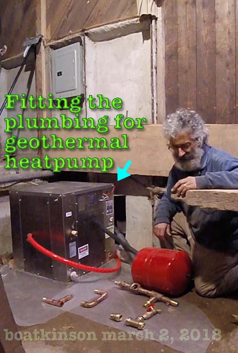 After a winter of uselessly building a more traditional heat exchanger system, a simplified, partially geothermal heat pump system was pondered and innovated. The product selection was not ideal as generic, "water to water heat pumps" are rare. That means a lot of guesswork and results were lacking. Actually most heating systems are sold to boost oil and centralized monopolies. The oil industry conducted civilization into a larger, wasteful monopoly.