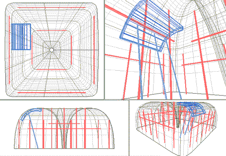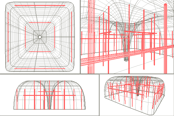 This writer would prefer using custom made ring reinforced mesh but this page will consider easily found mesh material. Additional mesh layering could easily incorporate rings, more on appropiate mesh will be linked here. A first attempt might utilize mesh with 1 inch (2cm) opennings, (such as animal fencing). The critical size of mesh oppenings should capture the largest of the concrete aggregates. Holes near to the largest stone size would allow smaller particles through, just enough to surround the mesh wires. (More on this will follow below). Below is a CAD unfolding which helps shape cutting patterns for mesh..
