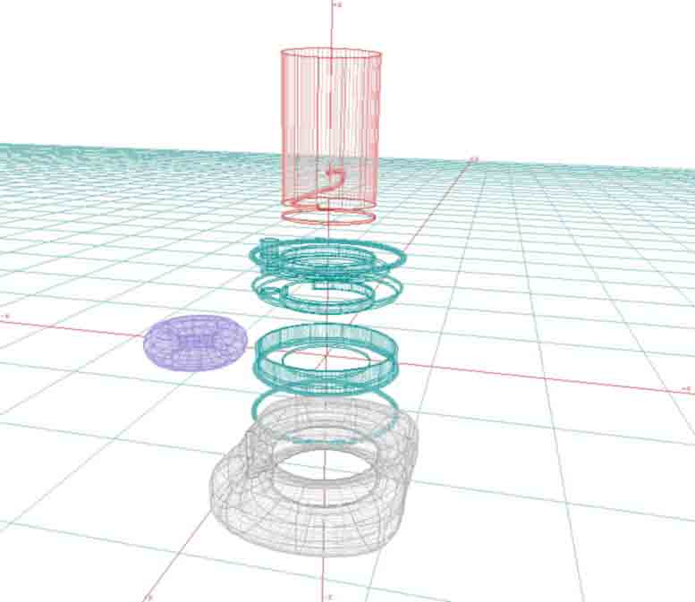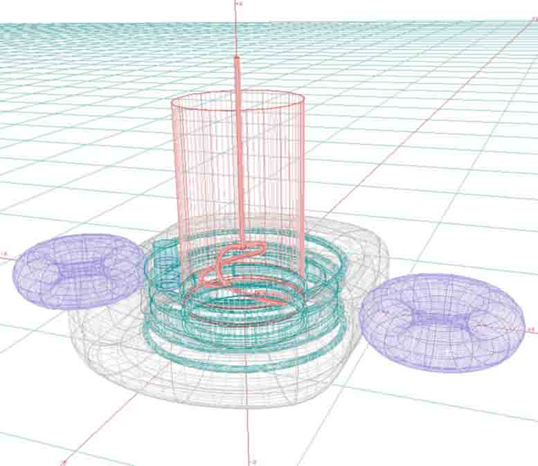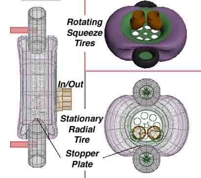 The red parts are a mixer / agitator / impeller. (The stopper plate is not shown in model below. It needs to be bolted to squeeze tire against "rim". Red parts also replaces the "in" tubing, brown part above). Green "rim" parts are cut bent and welded steel. Blue parts: rotating rollers or squeeze tires. (This upgraded rim detail is available. For easy printing on your printer, I can send you "gif" 2D format which your email and www-browser programs can read and print to scale,gif is better than jpg for this).