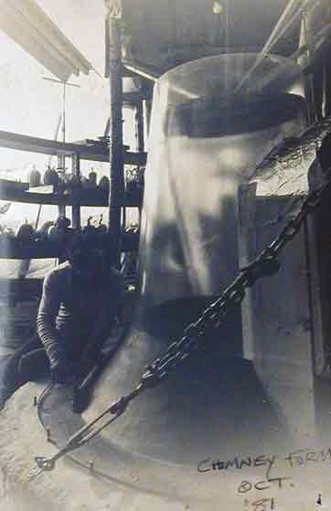1981: Hollow chimney formed on fiberglass, conical, translucent, fiberglass cylinder with earthen, flared base.