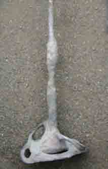Next on right side of picture above- The "S" has been separated into two "C" parts. One "C" part sweeps the bucket bottom, welded to shaft end. The other "C" part is a little higher on the shaft and angles down to gain more vertical propulsion inside bucket. The arrangement has seemed helpful for larger, (egg sized) aggregates. Half of a bucket diameter happens to equal a very common spring/ strut size to be found in older automotive junk.
