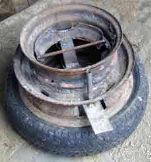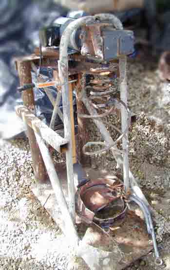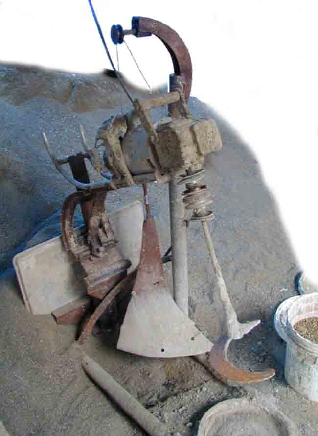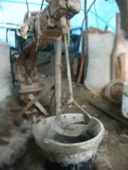 Next, below is a foot pedal bucket grabber for plastic buckets. It was improvised from auto wheels.