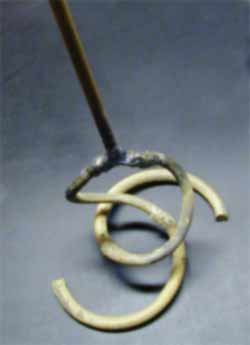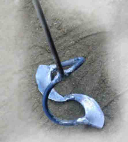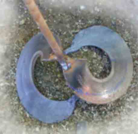 Still needing improvement(above) is a dual "C" section mixer more like a sculpted boat propeller shape. For a ferrocement mixer bit, cement could fill the space between two curve shaped rods.