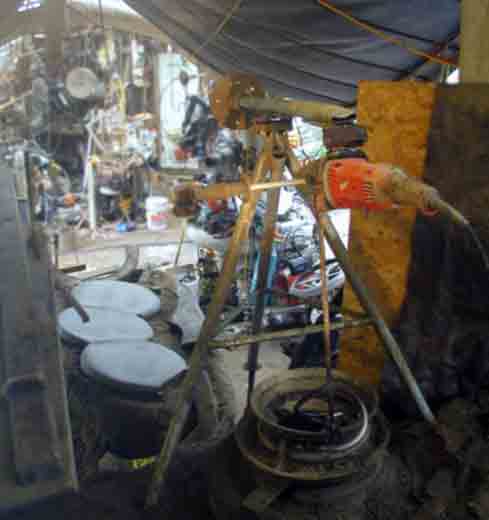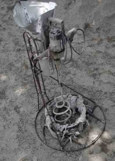 Picture Above: A cheaply made mixer experiment using a drill with a car spring for bit/ impeller. It is resting on a simple hanger which can very easily engage an electric trigger switch to allow stirring while adding material. See a building under construction which used only this mixer for tons of concrete mixing. Below, same drill mixer hangs from a welded rebar stand with slow feed hopper. Drill vibration vibrate-feeds dry mix into bucket. Bucket is held by auto wheel with rags tied around to softly grasp the bucket but allows bucket to turn slowly. Some small auto wheels are nicely sized and tapered. (Just cut out hub area). Add just enough rag to hold pail or adjust for slow bucket rotation which wipes the full bucket-- Almost hand free operation, while the mix is very wet, (water first). Strategy is to add last of the dry aggregate last. Critical point here: the helix whirl pool might haveto move around bucket or the bucket has to slowly rotate to get the whirlpool to finish mixing all contents of bucket. Some testers have not appreciated this aspect. Beware, it does take determination to prototype tools, to balance spinning impellers and to understand contexts of details.