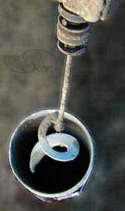 Above Right- A cheap effort to mimic the flat ribbon impeller similar to a "flight", see below. (A parallel bar was welded to a larger spring for a gear motor to impart greater loft for finer mixes but more loft demands more power. Sleeker bits are better. Below a short piece of spiral "flight" was used, (a little wider than half the pail diameter). Flights are used for particle conveyors and much more expensive than bending a helix. For dedicated fine grit cement mixing, it is far cheaper to put 2 helixes together or add a little curved plate at bottom. (See methods to bend corkscrews or to weld car springs below). The flight was tested for mixing fine cement, nearly instant mixing with well timed feeding of ingredients. The flight "pushes" enough to feed a radial peristaltic pump, (recycled radials). Metered feeding of ingredients for batch mixing is a reasonable possibility. A stack of old pulleys (found as junk), were welded together to adapt gear shaft to mixer shaft, (different sizes). (These are tin metal and require careful use of mixer, to avoid breaking). A counter weight (an old farming plow), is used to ease lifting of gear motor. (Odd framework is simply recycled bits and pieces had on hand). Reversible motor is a plus. One can reverse direction to push last minute additions to bottom. The pail/ bucket can rotate slightly as the impeller mixes. This evenly wipes all of the sides. The height of pail is controlled with just enough sand in base so that pail bottom is also wiped/ scraped.