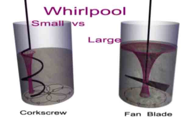The whirlpool of a corkscrew mixes top and bottom layers inside itself. Additionally, it can sweep the side, the bottom and even rotate the bucket slowly around. The effort needed to assure this is rewarded only by cheaper toolsets. People with better budgets or grander scales of operation will not likely find this useful. For a corkscrew with half the bucket diameter-- The whir pool is kept to a small fraction of the bucket volume which eases the load on the drill. Yet the whirlpool keeps mixing the otherwise stratified layers inside a bucket. Layer stratification represents poor mixing. By comparison a full bucket width impeller, can indeed whirl the entire contents of the bucket but does require more power to do so. Also, full bucket whirlpools are difficult to achieve with some particular mixes. Extra heavy drills are available, like the "Superhawg" above (US$340 in the 1990s). The weight and bulk of these drills has admirably been reduced with modern technology, but the prices can run very high for the best drills. Slow enough speeds are not popular with most drill uses. Slow speeds most suitable for plastic buckets are available from gear motors but gearmotors are to heavy too hand hold. The helix impeller research focuses on "small is beautiful", low cost small "whirlpool" mixing and needs only one versatile power tool: the ordinary, widely available drill along with moderate improvisational skill.