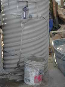Below: For cement preservation as well as faster production, a plastic bin is used to hold cement. Bags are designed in such a way as to absorb atmospheric moisture and unfortunately are harmful to cement in a humid climate. Measured amounts of cement are scooped and added to mixing pail seen in pictures. A simple, movable metal frame above bin with a knife like projection pierces bag. Once pierced the bag may be opened by pulling opposite ends up and shaking. The bin is easily open and shut in case of rain. This bin size holds 3 bags which allows uninterrupted mixing of considerable "mud". (One should avoid plastic bins which are or become brittle and break. Look for guarantees in product data).
