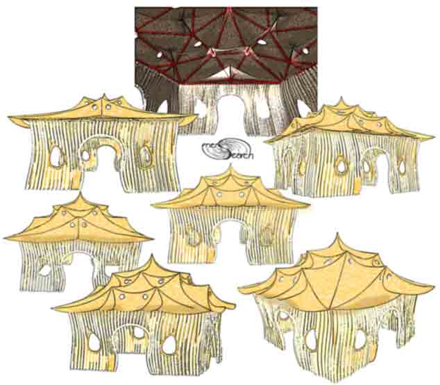 A conceptual, tensegrity rafter or truss plan is ferrocement, (shaded blue). It's geodesic layout is seen in the top drawing. The simplified cross sectional plan proposes a tensegrity effect. The upper and lower blue curves represent heavier wire or bar along which are spread the thin line blue helix trussings. The helix is pulled, spread and flattened into wet cement to form a curly mesh truss. The red represents the main tensioning member and the yellow highlight tension zones. Post tensioning these yellow zones is proposed to deflect surface stretching away from peaks and to compress valley surfaces. Tension members, (red and yellow), could have sleeving, (or external placement), to allow self tightening and slight vertical movement at yellow zones.