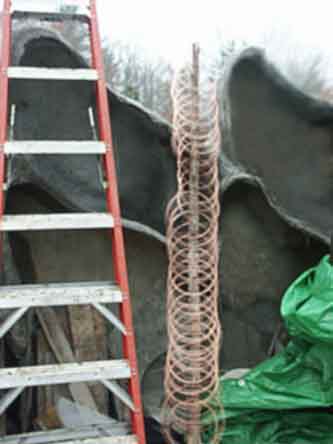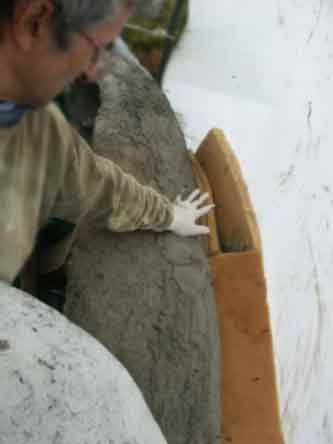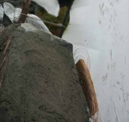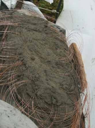 Below: A ridge of compacted cement has been made ready first. Then flat coils of wire were placed, with more cement to secure.