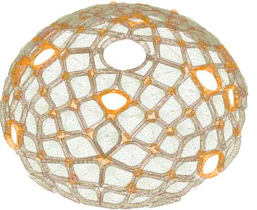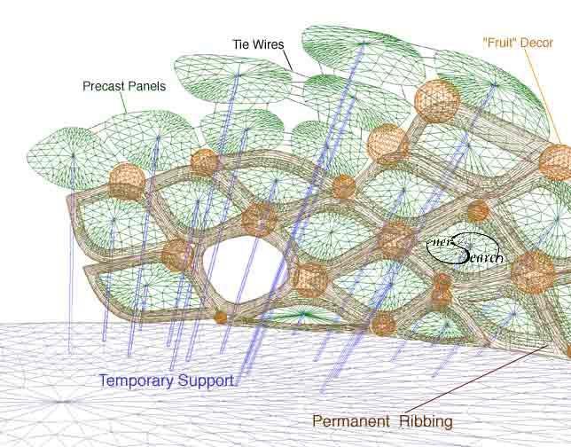 The images are based on a 3D CAD model which contains all necessary measurements. The overall dome design is an adaption of icosa geometry. Icosa tessellated and curved into an arbor shape. Other tile shaping is also under study. The frames represent branches. The panels represent leaves and would have better leafy texture than illustrated above. Click here to see a shell dome concept which can be built with similar methods.