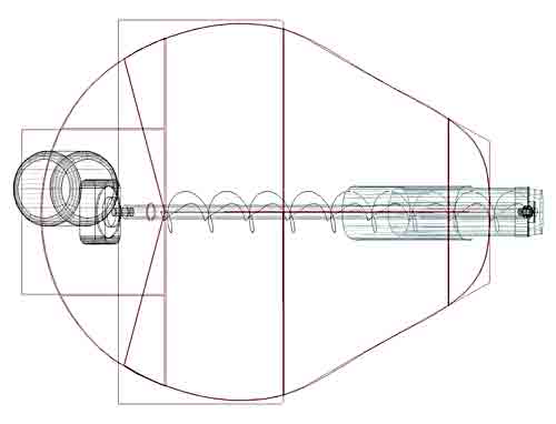 The purpose is to free a concrete man or mason's hand from mixing work. While a person mixes mud at double the cost, automatic tools should reduce costs. A one-man, best seller batcher could be manufactured and probably has not been produced due to manufacturer-sector obsessions with wood tool products.. Consider the stellar investment in power tools for wood working and the near absence of equivalent power tools for small scale stone work. (Small power tools for concrete and varied composite materials are largely custom built). Cementitious trades are held back from competing strongly, due mostly to lack of power tools. Cementitious or bonded stone is many artforms the wider market should discoverThe goal of this page is to encourage introduction of a small scale, portable batcher. A light weight, compact size, semi automatic, dial a mix, high efficiency design , (producible at reasonable cost. Screw feeders turned by gear motors meter the mix components into a common pail at center. The ingredients are regulated by a timer switch which can quickly "dial up" milliseconds of feed time, (and accurately). Each screw feeder is near the bottom of a sheet metal bin.