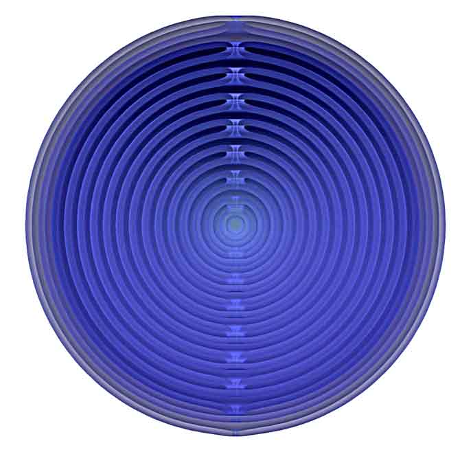 History of this page: This page visualizes dipole field configurations, in varied aspects. This page was started in 1996 on agate.net, later moved to midcoast.com and now rests here at harmoniouspalette.com. As an artist, builder and 3D modeler, my effort is to visualize physical structure in 3D volumes and also, as 3D surfaces. (In geometry surfaces means no volume and only surfaces area. Volume implies measurable material content). Modeling curved thickness is a challenge for (affordable) CAD software. Therefore my visualizations explore 'surfaces' and 'volumes' as if these could be thin shells or thicker shells.