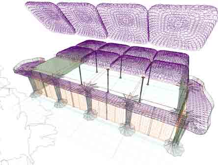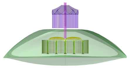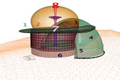 The collector tubes are portrayed in purple to indicate solar heating, since the ferrocement tubes are intended to be exposed to sunlight. The earth tubes located in the back are near to insulation umbrella to simplify the construction. It is proposed that a large excavator shape the dome of solid soil. The large excavator should work from center at ceiling level. (More plan ideas are available).