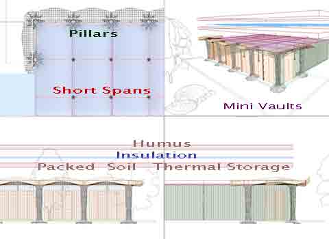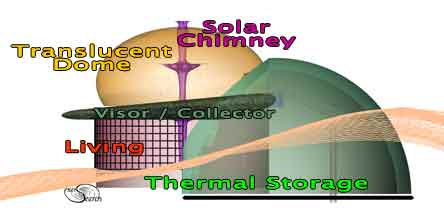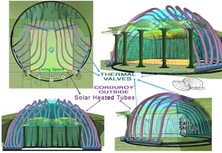 More standardized umbrella is pictured above, but with a simpler solar chimney, and greenhouse. The last picture below considers using a rounder dome umbrella which would have a ferrocement exterior shell. Corduroy heat collector built into exterior shell is thermally valved for natural control. Solar heated corduroy tubes then create a more classical thermal siphon to contribute heat to the earth tube storage behind the living space.
