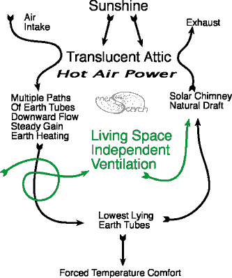 Numbers show passage of air entering into the attic greenhouse and then being drawn throughout heat storage. The solar chimney powers the entire air convection system through air tubes due to hotter air high within the solar chimney.