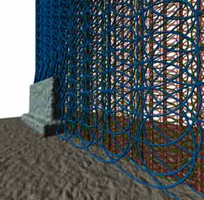 The footprint widens and concrete may pour through center. As concrete pours, it is held by rings and by temporary, moving forms. A three-dimensional mesh results, tying together height, breadth and thickness. (Temporary forms, not yet shown, are moved along with pouring).
