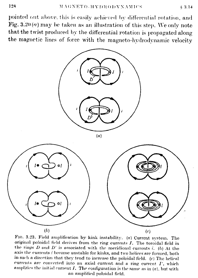 Quote from Caption part (b) "At the axis the currents i become unstable for kinks, and two helices are formed, both in such a direction that they tend to increase the poloidal field." This explanation may or may not have meant that both fields merge into one field, but the part (b) graphic does appear that way, and googling the word "poloidal", today, shows that atomic reactors are currently using the word poloidal, illustrated by a swirling flow.