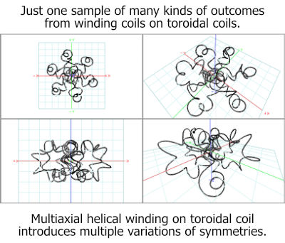 The typical magnetic field can be geometrically altered or differently structured by specially shaping coil windings and/or cores. This enjoyable idea explored many relatable forms in succession, over many years, and succeeding webpages were posted on harmoniouspalette, but this work was insufficiently correlated. This webpage begins to discuss the interrelationships of multi-axis helices, which begins with biaxially coiled wires.
