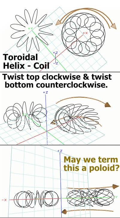 A curious biaxial precedent was later found in a physical library, (published long before personal computers), which somehow associated the term 'poloidal', for two orthogonal axes in one integral core, and of two or more intermixing axes. A hard bound book Magneto Hydrodynamics described something similar, about astrophysical phenomena and as a specialized word usage, (and this book did not show up in google search at this writing). The term poloid was affectionately adopted for biaxial helices, except that the obscure astrophysical terms are not common. Next is page 128 from the book.