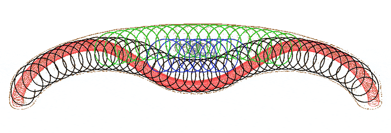 The concept above effectively doubles compressive arch spanning. A clear span, Mexican style Bobedero finish is rendered quickly in formZ. The visualization below depicts the recurve cable truss. This truss would be made with high tensile, flat coiled bars, wires or filaments. The flat coils would amply overlap. (Several variations appear on this website.) Colors are used to help distinguish the individual coils. The heavy black represents the largest coil. The red coil follows the cable path as in a suspension bridge. This red recurve might be replaced by a simpler (set of) cable(s) or bar(s) as shown in some associated models. Ultimate specifications are the domain of engineers, (while the pages of this website are in the conceptual realm primarily). The other colors help distinguish the - overlapping- continuous- coils. These coil or ring like reinforcements bind the entire truss together, after concrete or other cementitious composite consolidates the whole.
