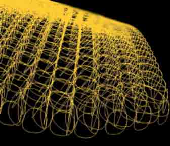 Pictured above are 10 helices of 10 turns each, raised at an angle to span 3 dimensions. While ringed reinforcement ties inner and outer surfaces together, additional long wires or bars may be fed through the rings and therefore provide tensile strength along exterior surfaces. This is believed to complete the truss effect, for each path the bars are inserted. To see this illustrated, click here.
