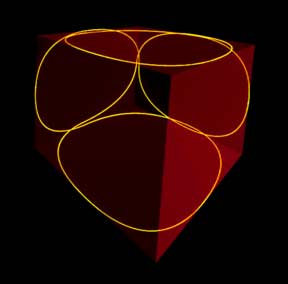 Next above is a model of a four turn helix which has been bent to fit around a specially tapering cube, (which has six faces). The helix is presented here in hope of clarity, but four individual rings might serve equally well. It is proposed that 4 rings positioned and stabilized like this may serve as a module useful in construction and manufacture generally. Proportions may be suited to specific needs. The quantity of rings might also vary and conform to other polyhedra like hexagons, tetrahedrons, etc