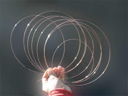 This page reports on some gradual progress with coiled mesh prototyping. First a finger formed mesh is shown in first photo below. Using stiff welding wire, the loops fan out easily and can be planted in wet cement for reinforcement. Wet cement will hold these tensioned loops in place. Multiple sets can be overlapped to form a continuous mesh effect.