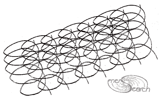 A hand made mesh test above is linked simply by sliding loops of one flat coil trough the loops of a neighboring flat coil. The 7 flat coils shown above could be formed simultaneously and "squeezed" together. The picture below shows a workable bending pattern which causes a flat coil to spread in a linear direction. Beginning with a "relaxed" (un sprung) coil of stiff wire, bend as arrows direct. Upon release, all 22 turns will offset the next turn in linear fashion. The same offset can be made with a cam or like mechanism, for continuously fed flat coils. The result is comb like in that the more pointed side can easily feed through adjoining coils to create job site meshes, of "endless" length. Plastic filaments may need a little more mechanism to "weave". Steel wires might weave with simpler action since wire is stiff enough to push through loops, as compared with plastic/ textile filaments.