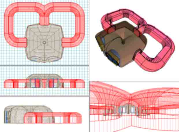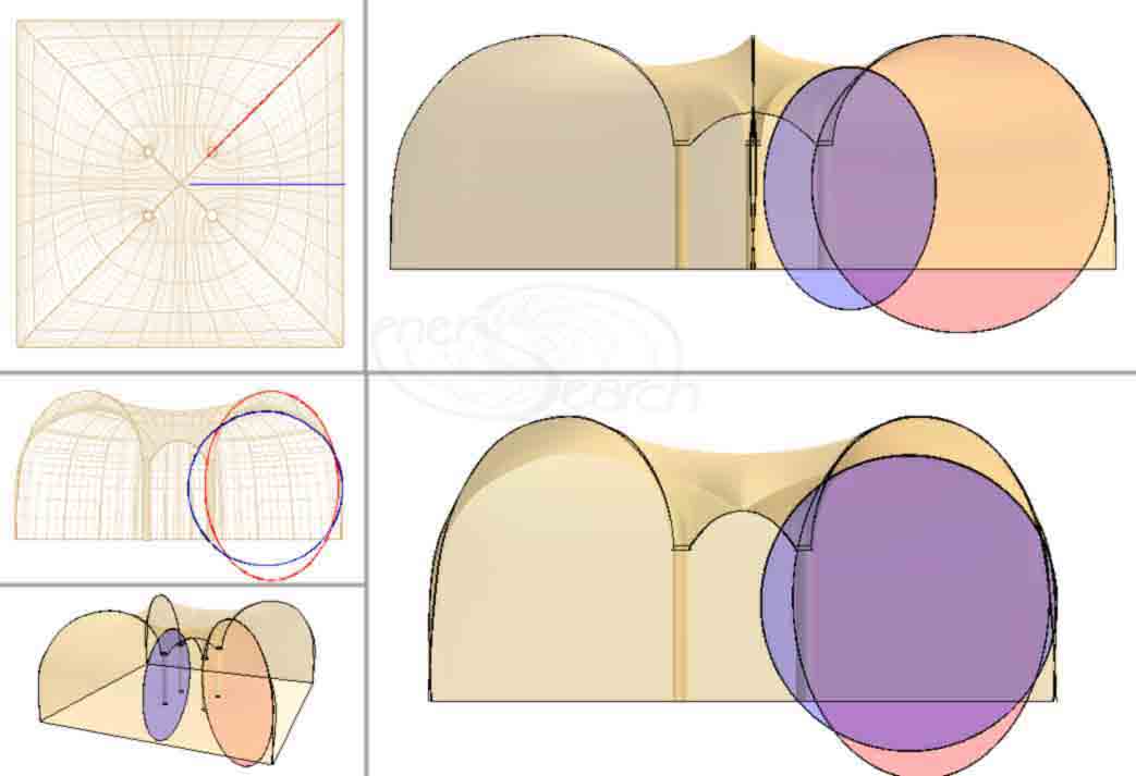 After discussing the advantages of adding a pillar, for a couple of years on the ferro cement forum... Mexico-Steve adapted his preferred forming system to an octagonal base. MxSteve might in fact be the world's first and only builder of a square donut structure! (My own effort was stopped when my client abandoned a 2007 project, involving my first square donut project. Such is life). However, the point of my page is to explore optimized surface geometry and meshes. Factory produced meshes bend easily in one direction only, (planar bending). Factory mesh does dominate markets. Trimming the mesh, or mangling it, can force fit a rounded donut surface (shape). These are non-optimal reinforcement patterns. Yet it is expedient to adapt familiar materials and crews, instead of starting to develop newer compound curve mesh systems. The traditional Mexican and Eurasian barrel vaults have used planar surfaces and do not form full circles or "donuts", nor significantly rounded corners. Perhaps fully rounded, circular vaults are found in India or Asia. Angularity persists in the west, where optimized geometry is overlooked in favor flat and angular structures. Mavericks endure derision and rarely get hired, but this provides time to contemplate optimizations. Steve Kornher and his Mexican maestros build remarkably beautiful vaults and other inspiring works in Mexico. The challenge of labor saving methods for building vaults gradually prompted the concept of tilting up four vault sections in sequence. As always, computer models with precise geometry gave confidence of getting proper clearances and devising efficient scaffolding.