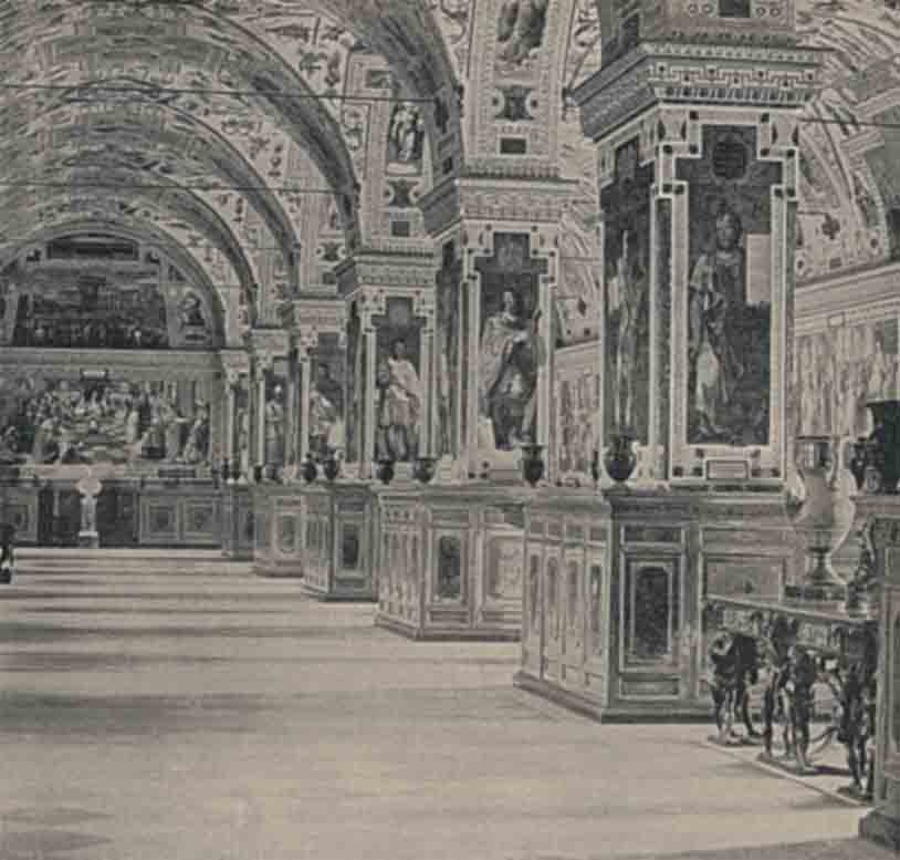 (Vatican Library Photo: From a collection by John Stoddard, C.1892). Thick columns splay out at the top. The square donut pillars adopt a similar pattern as traditional intersecting arches. The square donut approach smooths and rounds the seams between arches. Smoothed surface, material optimizing is the objective instead of sharp and hard corners of traditional masonry. Steel cross ties were added after the industrial age came, perhaps as an after thought, where modernization can optimize structure with internal reinforcement, updating from former masonry and former concrete without reinforcements.