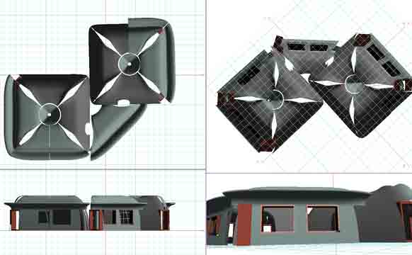 This squared torus geometry offers the compressive assets of arches combined with square floor plans. It is a circulating barrel vault shape. Compressive efficiencies are conservational and can reduce wastes. It could be made of thick concrete, thinner ferro-cement, or other alternative building materials as well. Calibrated engineering could adapt it to withstand heavy loads of earth-covering, hurricanes, floods, earthquakes and disasters-generally. The square donut concept came in 2005, and was discussed on a ferrocement forum. It seemed that making a square unit with rounded surfaces would optimize the traditionally squared corner vault structure. Allowing that traditional building markets had lacked optimized strategies like ferro-cement. Unoptimized structures are generally adapted by everyone, including ferro cement enthusiasts. Geometric and practical optimization is the inspiration here.