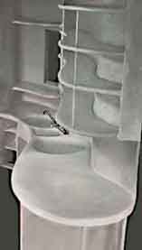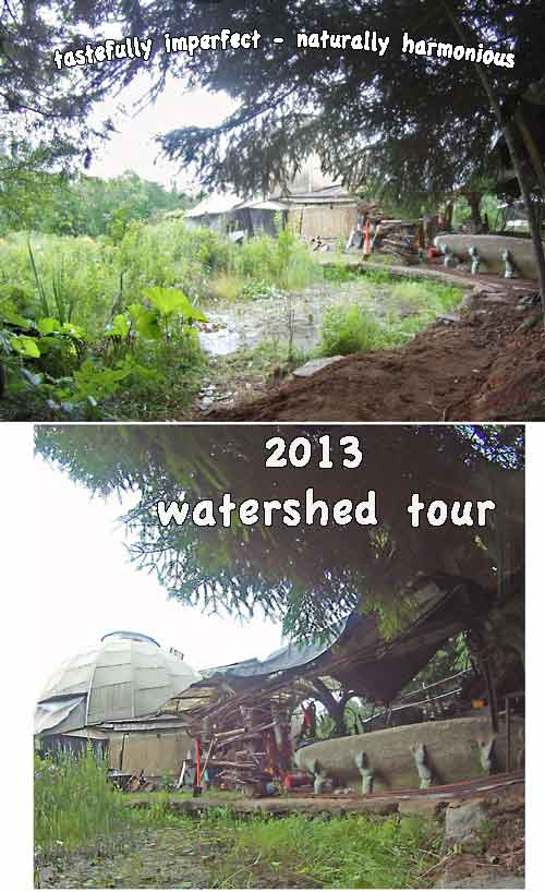 The down stairs (vertical, cylindrical wall), is ferrocement, built in 1976. I was very interested in ferrocement at first, but have now begun exploring a new synergy of ferrocement, concrete and old masonry methods. (Curved construction is also key in this study.)