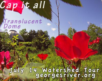 Above:1995 Photos A second glazing or covering was added directly over the first fibre glass glazing, (which was installed in 1980). I would offer more pictures here except that media-styling is not my point, rather i am promoting the exploration of harmonious life styles. In this regard we had to build with a very small budget and for the most part single handed). This dome is located in a temperate climate with frozen winters, in Maine USA. My wife, who tends her floral greenhouse spaces, accepted mostly live soil conditioning, which introduces a complex 'wild' ecosystem. This requires continued work for the occupant and tender, but this kind of work is useful as an alternative, practical exercise. As visionaries, we evolved and interacted with IPM (Integrated Pest Management). We have explored living closely with live ecosystems. Most of the work involves watering, tending to ventilation hatches, careful clean up of plant-invader debris and fostering of beneficials.