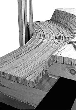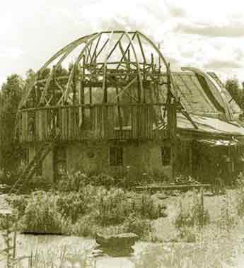 An old sketch drawn with a by gone software program, illustrates the original design objectives which were experimented with, (click here). Below are snap shots taken while building the dome with laminated arches. Each arch was built in "dog clamps" on the second floor, (see 2nd picture below). Lightweight cedar was used which allowed me to raise each arch while I worked alone, (no help, my wife hates climbing). It took about 7 months in 1980, (to build the translucent dome shell single handed). As can be seen below, this dome intersects an existing old, run down cape house. The dome covered and replaced some of the cape house. The materials costs were paid out of earnings, from year to year. About 2000 sq. ft. of fiberglass sheathing was used in one layer, 40 mils thick. Materials for the 42 ft. dome cost about $3,000 in 1980. Soon after finishing the dome, additional layers of copolymer plastic sheeting were added from inside for insulation. Some 2nd floor areas still intact after 25 years, received 9 layers of co-poly with air spaces between each plastic layer. Interiors are still in various stages of deferred completion. Good thing my wife and i didn't get a mortgage, being without debt leaves time to explore freedom.