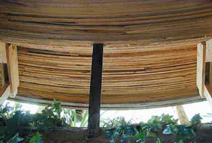 Next photos above: First, a picture of green house bench under construction (in the 1980s). Next a view looking up from ground floor underneath the orchid green house bench. These were coated with waterproofing. However all the floor surfaces were eventually covered with rubber roof sheeting. Rubber roof material has proven far more effective to waterproof entire floors. Thin coating materials from ferrocement to rubberized coatings all developed leaks, eventually.