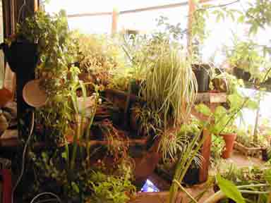 Also an apparently good control for mildew is simple pressurized water spray followed by floor sweeping up. We get very little ventilation during winter due to conserving heat. Electric fans can use a lot of expensive AC power. Solar fans may one day make sense but the capacity needed is expensive. Another hope in my heart is use of ultra violet light treatment or perhaps ionized air or both. I bought a small unit but it was hard to tell if it accomplishes much. A big unit or selective frequency spectrums might do more, but it is hard to manage purchases like that. (Due to lack of benign research budgets, on a planet devoted so much to perpetual wars for profits). Sadly, the ultra violet sun rays (UV) are filtered out by the dome shelter and the UV also wears out almost any material over time. With patience, society may yet find better building materials to let just enough UV in, as does the atmosphere. Developing a green thumb attitude really has been essential, but i am impressed at the crop of flowers and figs (an assorted foods). We now patiently are trying avocados and peppers which can't propagate outdoors (here in Maine).