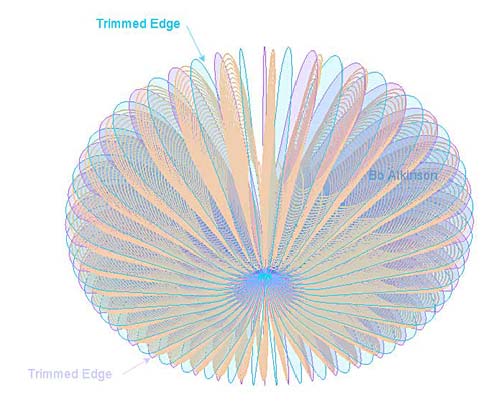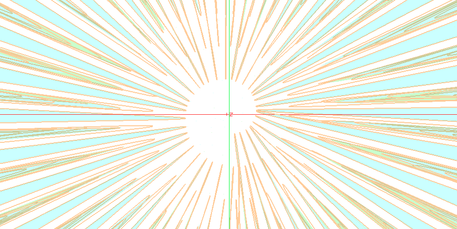 The radial transversal was generated by means of routing a regular helix form upon a scaled helix form. In other words one helix upon another helix. The image below displays a close up view, of the coil center. The spiral path is evident. (The green-red cross is the xyz axes).