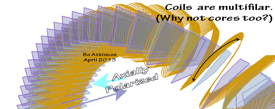 Ultimately, many individual, parallel coils are to be laminated. This transverse-deflection is the main concept discussed on this page. It has inspired the configurations presented further below. It serves as my postulate to build prototypes, in due course. The unusual field character provides me the spark needed for action.