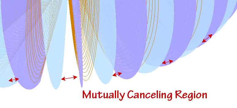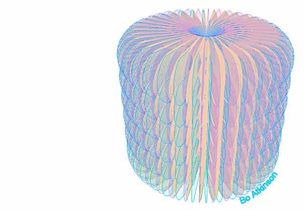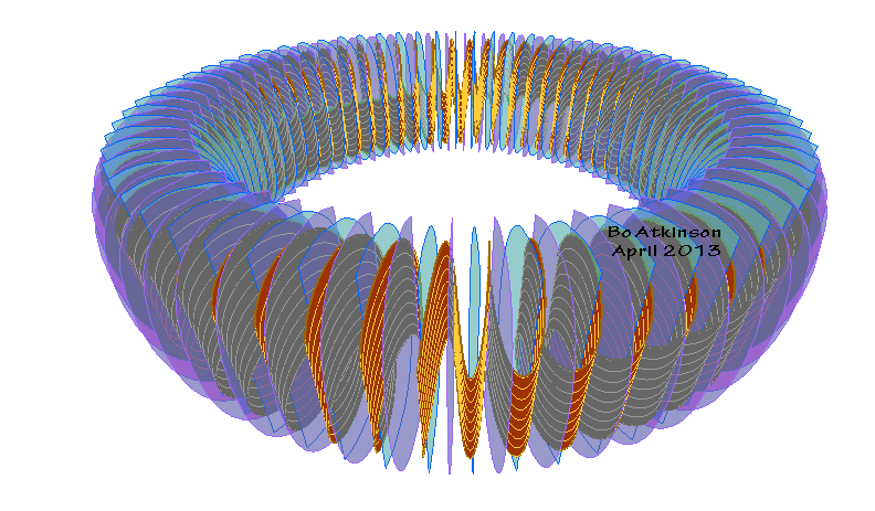 The oscilloscope-photo shows my typical harmonics achieved with older, cruder coils, which bear some aspect of transverse induction. I have wondered if frequency harmonics (from swirled or swerved magnetic fields) could become significant frequency multipliers. (Achieved with coils alone, without external circuitry ). The rounded paths lend more to my postulate of frequency transforming effects. At this writing ,the fullest implementations of transverse winding configurations, have yet to built and tested. My focus so far has been primarily geometric modeling. Conceptual modeling clarifies efficient probabilities, where some of my models are challenging to build with my humble tooling. My goals can be set with the limited apparatus and equipment which i possess. Here are other pages of this series of webpages, which focus on transverse force fields: