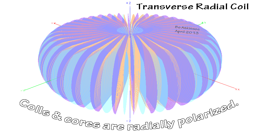 The convergence and divergence, within close proximity to the drawn plane, deserves further investigation. I have wondered if the term "transverse induction" might apply. However the the term "Transverse Force Fields" may be more conservative- Given that something other than inductance may yet transpire. Singular core strip might prove more interesting. Or possibly two or more strips all together may prove more interesting, (like laminated cores to reduce eddy currents). Or instead of core strips, amalgamated coatings might prove more interesting. Coatings can fill up the pie-shaped nature of the radial arrangements.