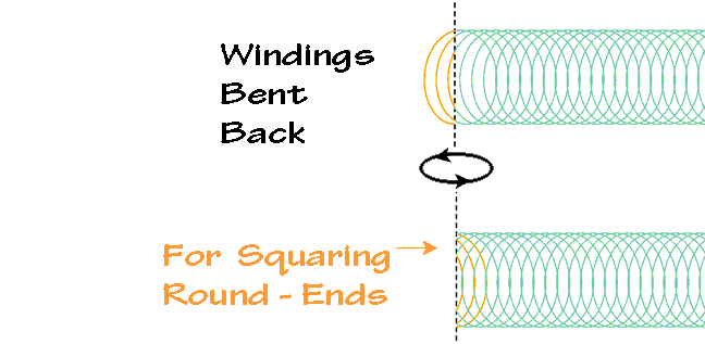 For complete winding coverage, over the expanse of the core-surfaces, (in next image), illustrates a method for bending windings. This feature can actually be done fairly easily in real life. However adding this feature to these models is omitted, here. An important note: This bending axis, (dashed line), will be at the ends of each core-- in case increased inductance is sought for.