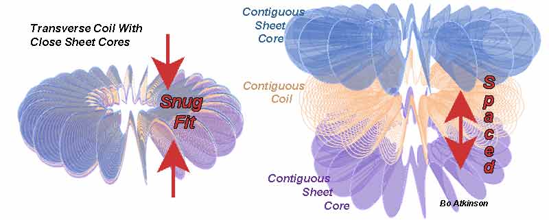 (Later Addition RE: Sheathed Cores) The next picture below illustrates use of sheet like cores. Transverse radial cores and coils, might be prototyped by use of magnetic-core-coatings. (in that sheets are difficult to shape with needed precision). The sheet material has been rendered (imaged), semi transparently, to improve the visualization. The spacing or separating of the cores, (in image below), only emphasizes two polarized cores and one,contiguous, matching, coil configuration.
