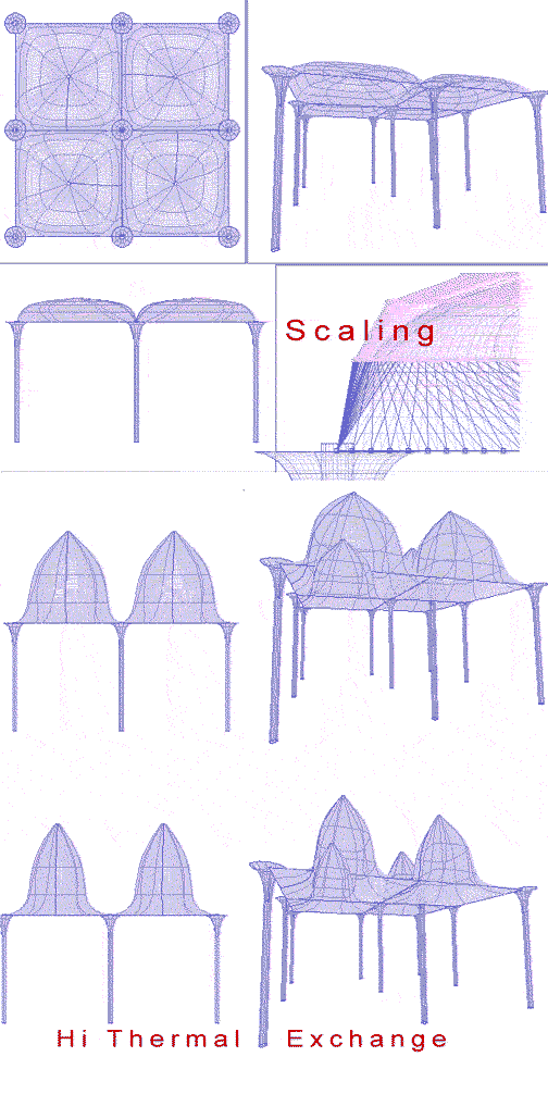 Here are some ideas for building cementitious vaults. This page features CAD models of vaults using strong, lightweight, ferrocement. First a height saving vault is shown which can be scaled taller. Further below, subdivision framing is presented of this flattened vault style. The first picture scales the same CAD model. First some height is scaled. Next the high vault is scaled narrow. Improved span capabilities and larger thermal exchange surfaces are considered here. While the vault surface can be thin ferrocement, the mass between vaults can be compacted soil materials.