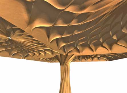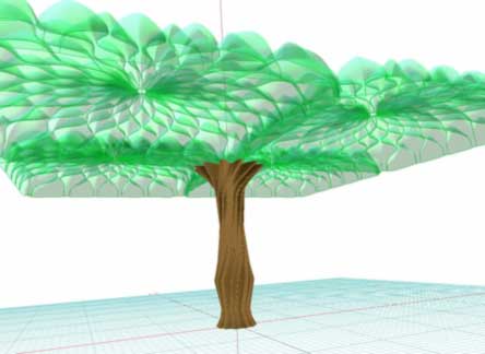 After filling with cement above, the voids could optionally be filled with lower strength- lower cost concrete, in order to level as for a floor surface. Next below the computer model is rendered in green to suggest a leafy tree-like to a vault ceiling. Coloring and texturing of cement could suggest a variety of appearances.