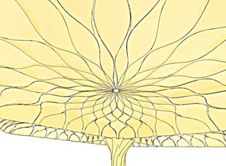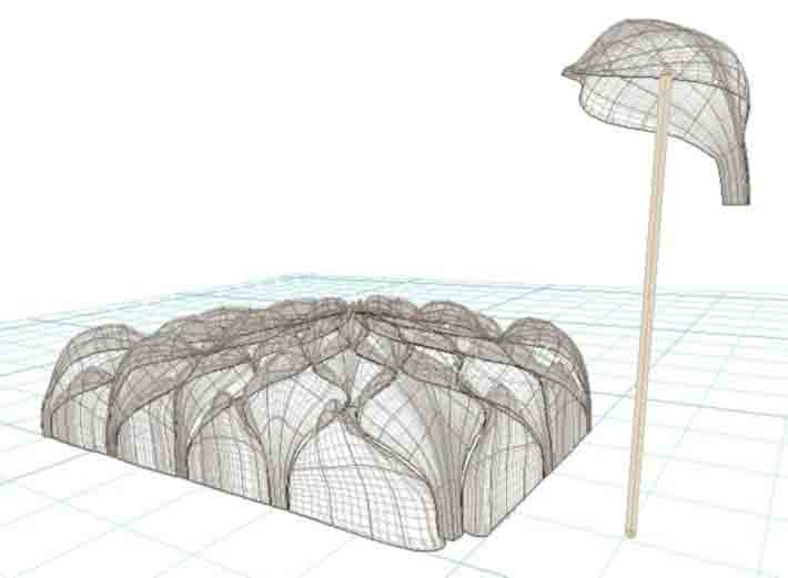 Below, sub-division sections are portrayed on ground, as if clustered on a sand mold. (Wire frame display again). A single section is shown atop a pole as it would be placed overhead in final vault assembly. This particular section was measured by CAD and weight for a finger thick version might weigh between 60 lbs and 30 kilos, not bad for vaulting into place!