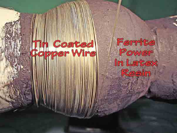 The layering of the pictured coil winds over a cement core. The ends of the core are old plastic jars, cut and taped. Multiple alternating layers of wire and ferrite (magnetic) coatings were lamented in place. The next picture shows the internal core before any layers were wound or coated.