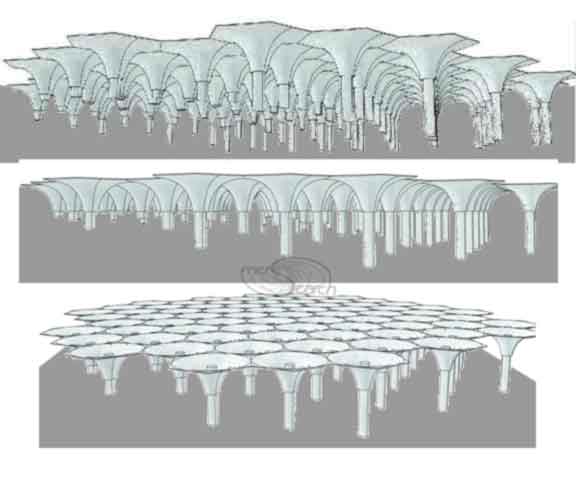 Pillars are poured concrete. Capitals are sand cast flared cones shaped to regular hexagons on top. Picture below shows essential shape. Capitols can be cast with reasonable tolerances and efficiency. After installation, the hollows may be filled with economical concrete and leveled. A monolithic slab or other surface is then possible.