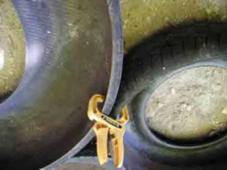 Below is a mock up of how individual tires will be held together using clamps. However the steel wheel centers will be left in place. Sapling trees will be used support the form work. Rusty, recycled wheel rims might hold tires well but cleats might be also welded to prevent rubber from slipping off. An attempt to split rubber tires (picture below) without cutting steel belts will avoid worker exposure to sharp metal while handling molds. Each converted wheel will be supported on an individual pre sized pole .